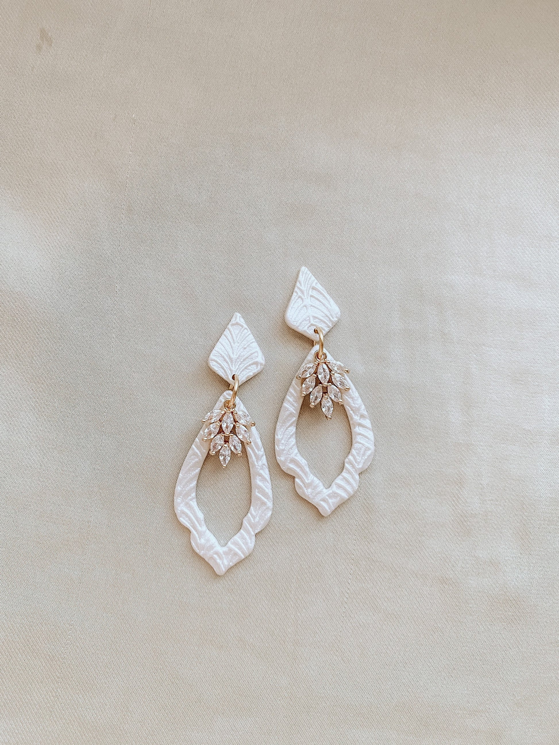 BESTSELLING handmade pearly white polymer clay earrings with textured detail & gold cubic zirconia leaf charm. Clay has slight shimmer.